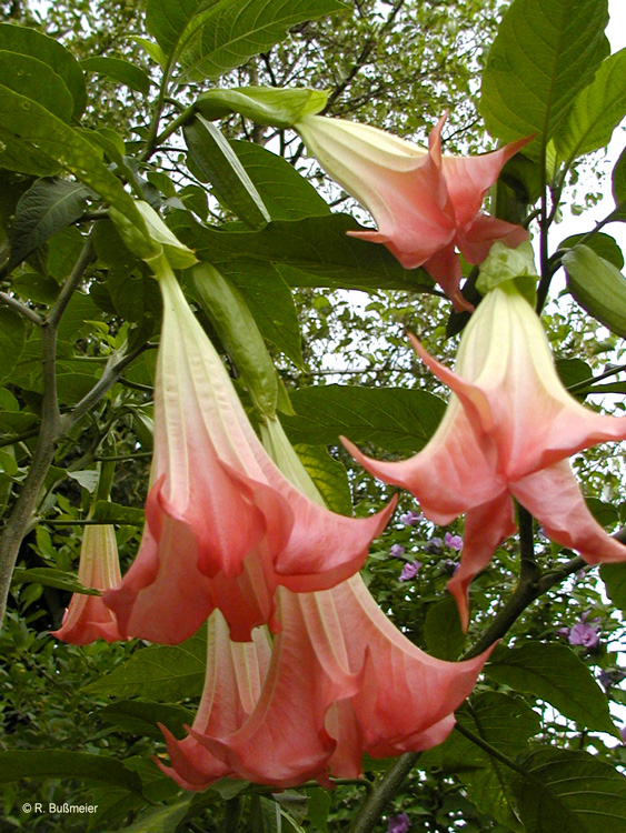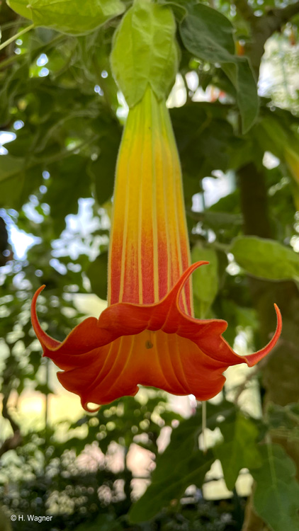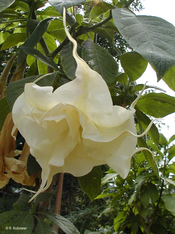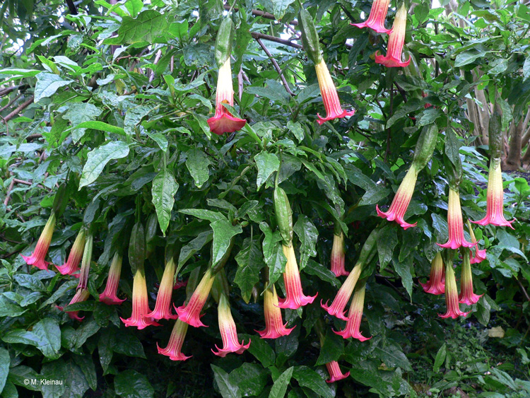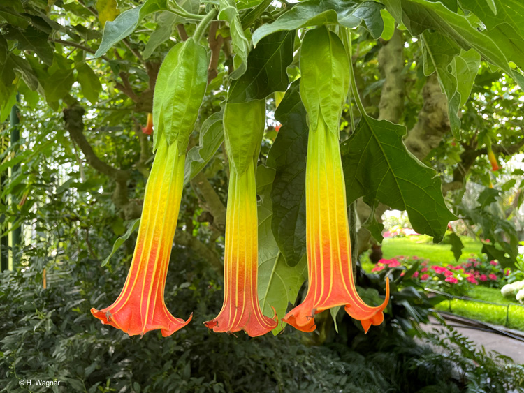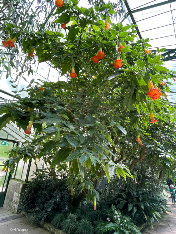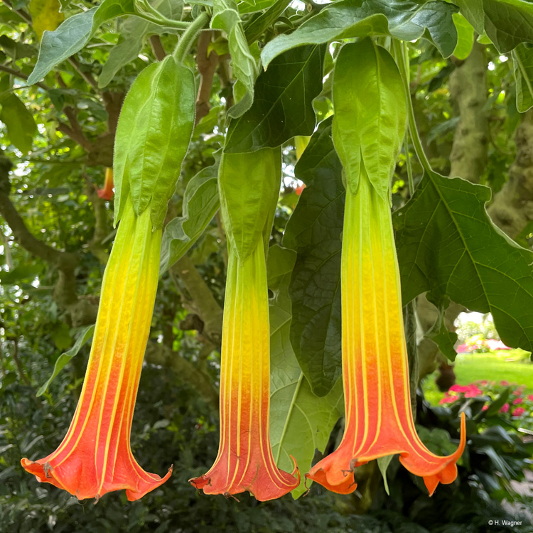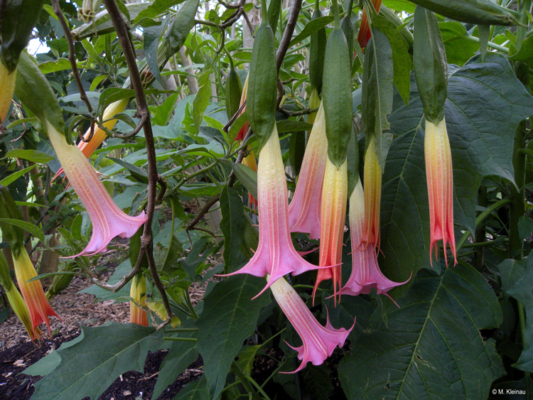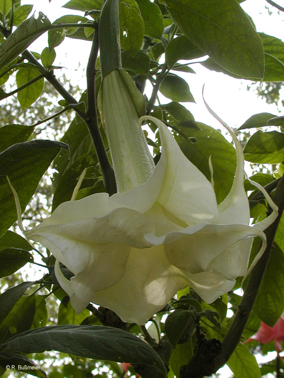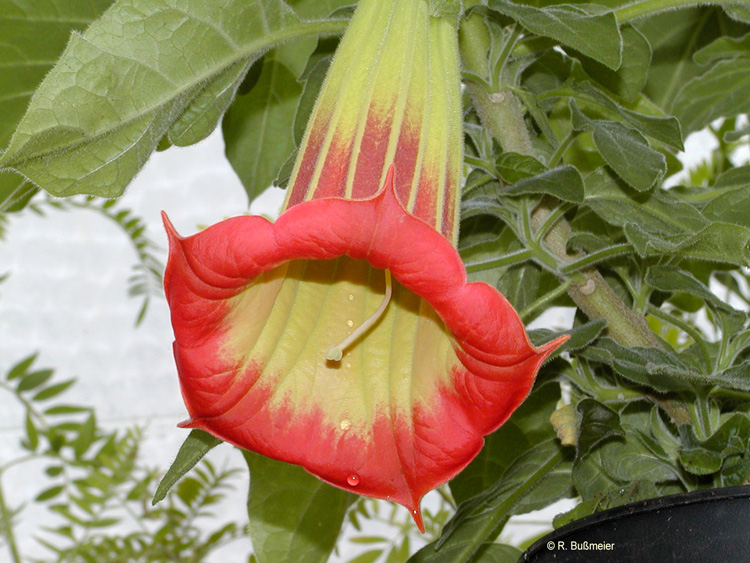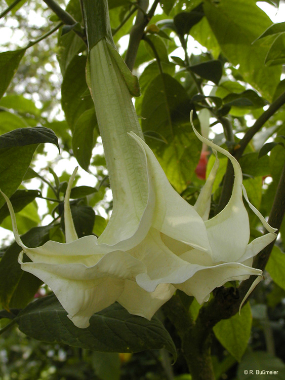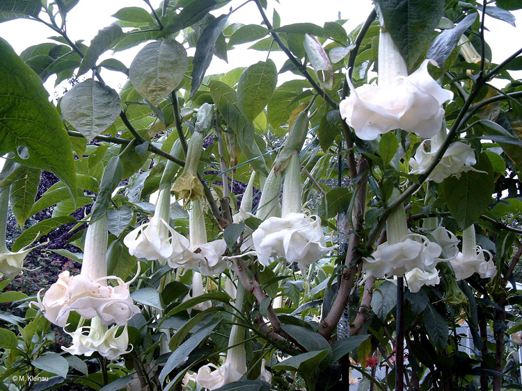 Bei Überwinterung im Wintergarten bei Temperaturen >12°C können Brugmansien auch über Winter Blühen. Im Wintergarten unbedingt auf ausreichend Luftfeuchtigkeit achten, um Spinnmilbenbefall vorzubeugen.