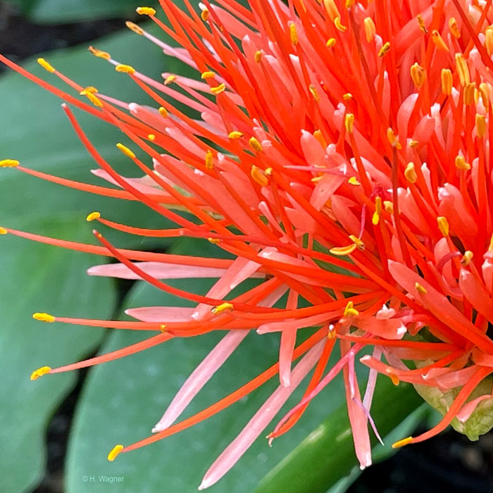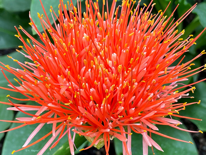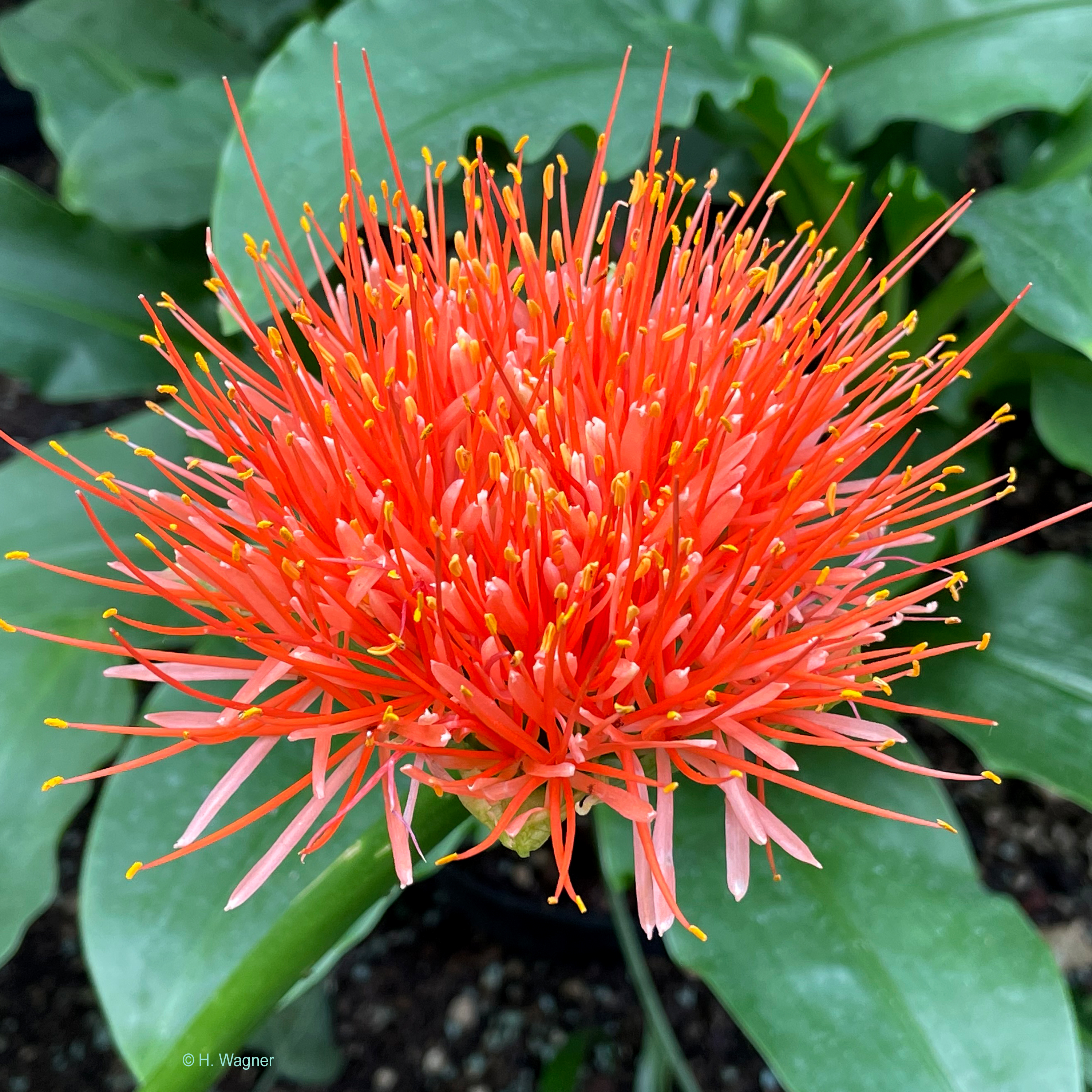 Die Pflanzen dieser Sorte entwickeln im Frühjahr 25 – 40 cm lange, länglich geformte Blätter, die den Topf meist vollkommen abdecken. Von Juli bis August erscheinen die äußerst eindrucksvollen scharlachroten Blütenstände. Sie bestehen aus unzähligen röhrenförmigen Einzelblüten, aus denen die langen Staubgefäße herausragen. Diese Blütenstände erreichen oft einen Durchmesser von 18 – 25 cm und halten etwa 4 Wochen.